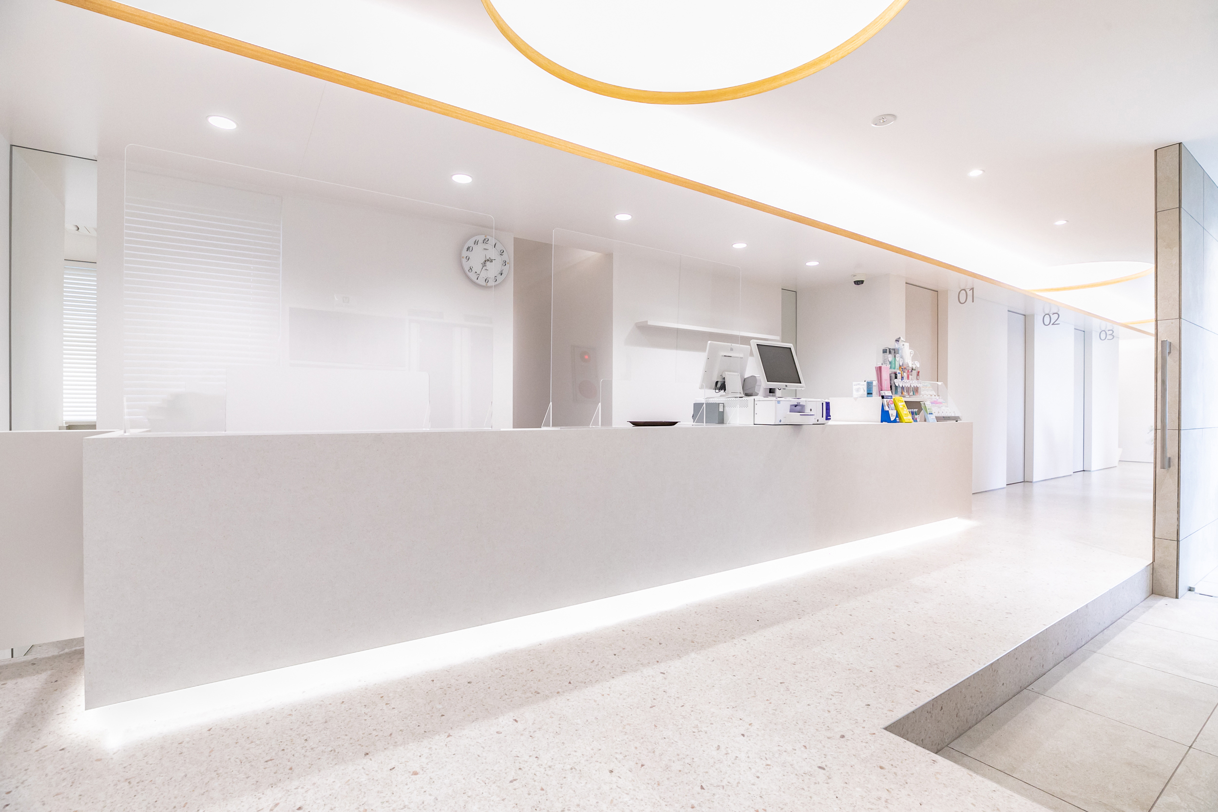 受付 白を基調とした明るく清潔感のある受付です。患者さまが来院されましたらスタッフ一同が明るい笑顔でお出迎えします。緊張なさらずにリラックスしてお越しください。