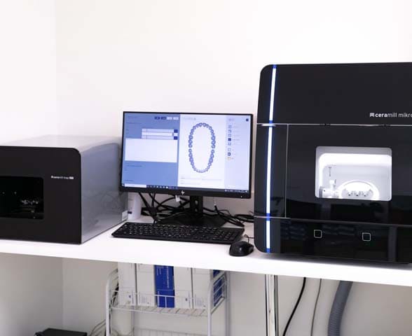セラミック(陶材)で作る白い補綴物(詰め物や被せ物)を、コンピューターで設計・製造する機器です。口腔内スキャナーで撮影した歯型のデータをもとに、患部に合うようコンピューター上で設計され、その後セラミックのブロックが削り出されて仕上がります。短期間で質の良い補綴物を作製できます。