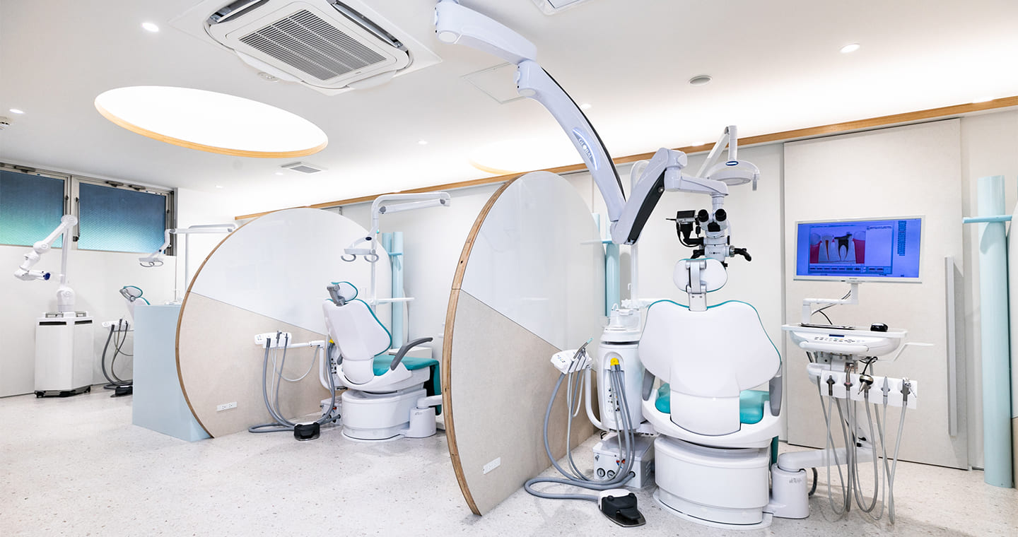 診療室 明るく清潔な診療室です。各ユニット(診療台)がパーテーションによって仕切られているので、ほかの患者さまを気にすることなく個室のような感覚で受診いただけます。